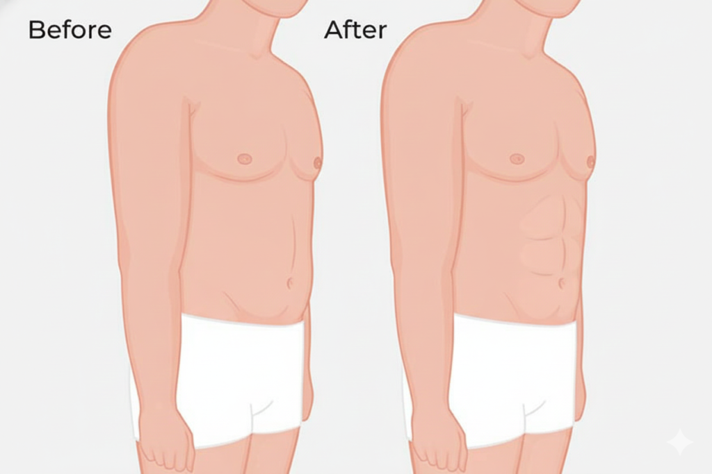 This technique not only reduces excess abdominal and waist fat but also enhances muscle definition, helping achieve a toned, athletic, and masculine contour that diet and exercise alone may not provide.