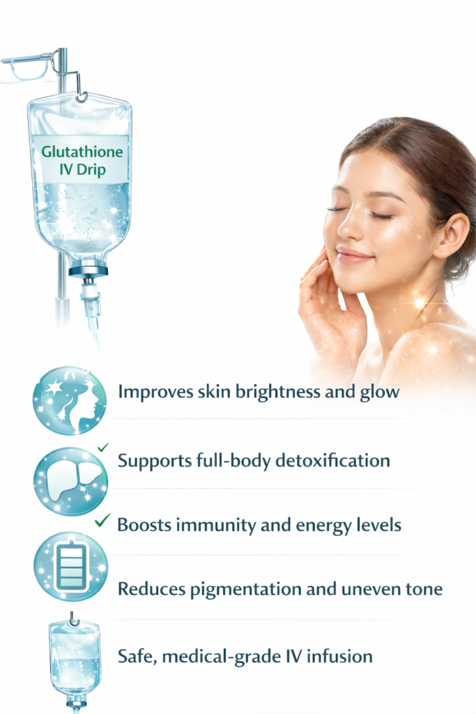 Fairness and wellness treatments using Glutathione IV drips are commonly referred to by several medical and cosmetic terms depending on the technique used or treatment approach. These include Glutathione IV Therapy, Skin Brightening IV Treatment, Skin Lightening Drip Therapy, IV Antioxidant Therapy, Whitening Drip Treatment, Glutathione Infusion Therapy, Skin Radiance IV Treatment, IV Skin Glow Therapy, Detox IV Drip Treatment, Beauty Drip Therapy, Skin Whitening Infusion, IV Wellness Therapy, Antioxidant Infusion Treatment, Complexion Enhancement Therapy, IV Skin Rejuvenation, Glow Enhancement Drip, Vitamin C & Glutathione IV Therapy, IV Beauty Infusion, Skin Tone Improvement Therapy, and Advanced Skin Brightening Treatment.