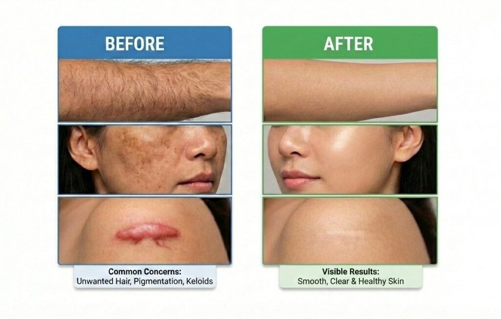 Laser treatment offers a safe, effective, and non-surgical solution for a wide range of skin and hair concerns. Using advanced laser technology, treatments such as 4-Wave Diode Laser Hair Removal, Pigmentation Removal, and Keloid Reduction help improve skin appearance, texture, and confidence with minimal downtime.