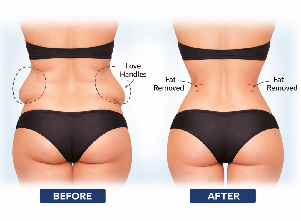 Love Handle Liposuction not only removes unwanted fat but also enhances confidence and body symmetry by creating a slimmer waistline and smoother body contours. By targeting stubborn flank fat, the procedure improves overall body proportions and helps achieve a more balanced, sculpted silhouette.