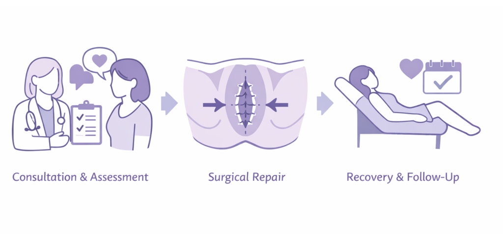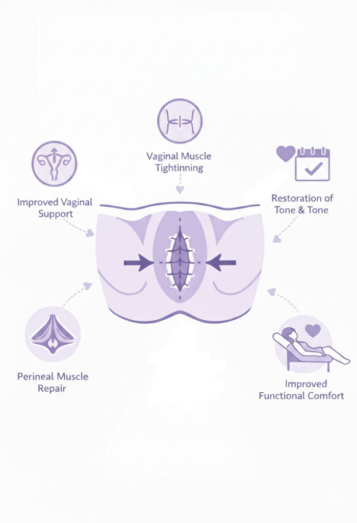 Vaginoplasty is a surgical procedure used to tighten the vaginal canal and improve support. It is typically done by removing excess tissue and carefully bringing the underlying muscles closer together with sutures. This helps restore firmness, improve structure, and recreate a tighter vaginal tone, often similar to the condition before childbirth.